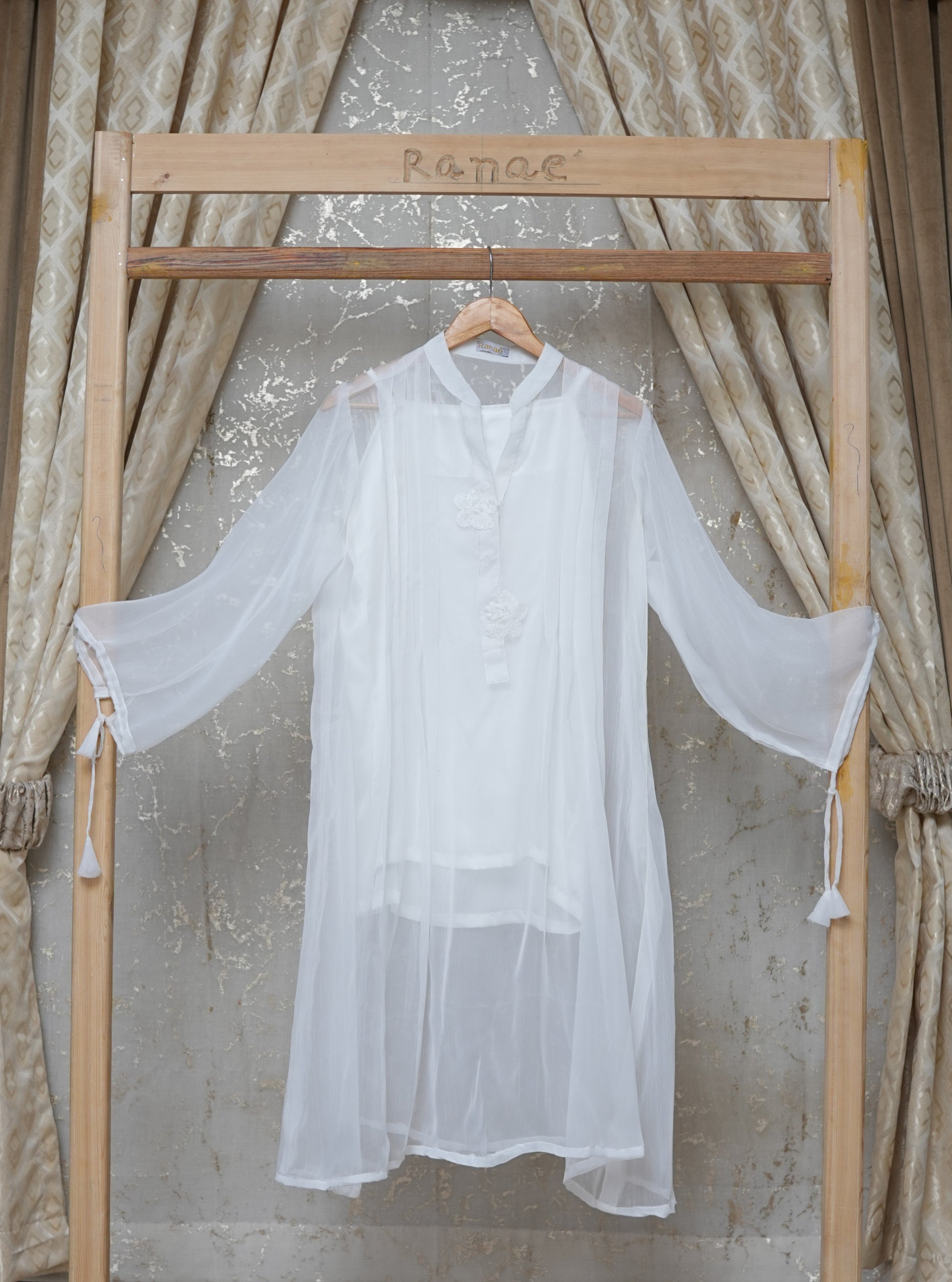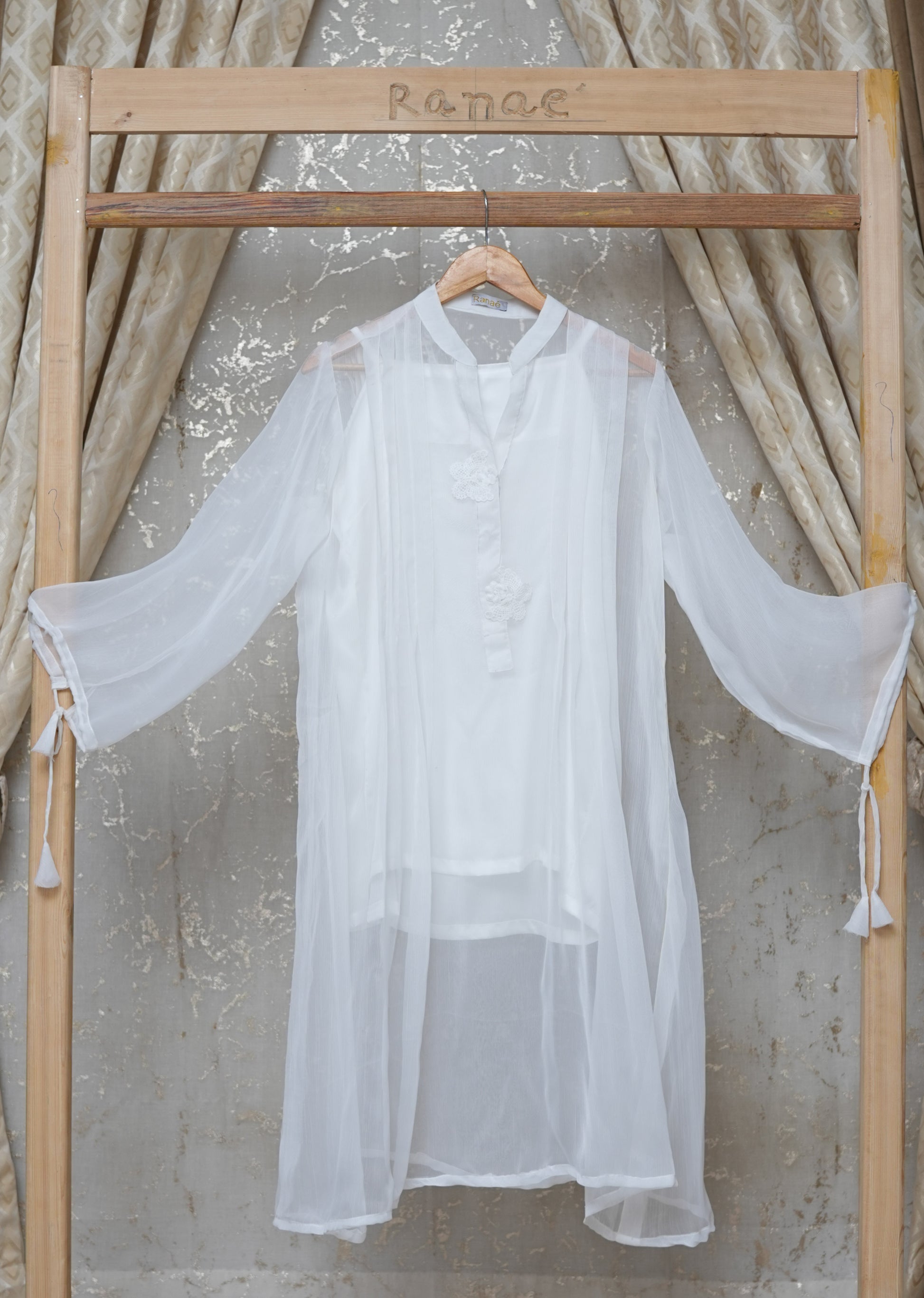 A chic white crinkle tunic with silk camisole, butterfly brooch at the neckline, and playful fabric tassels on the sleeves—luxury designer wear with timeless charm.