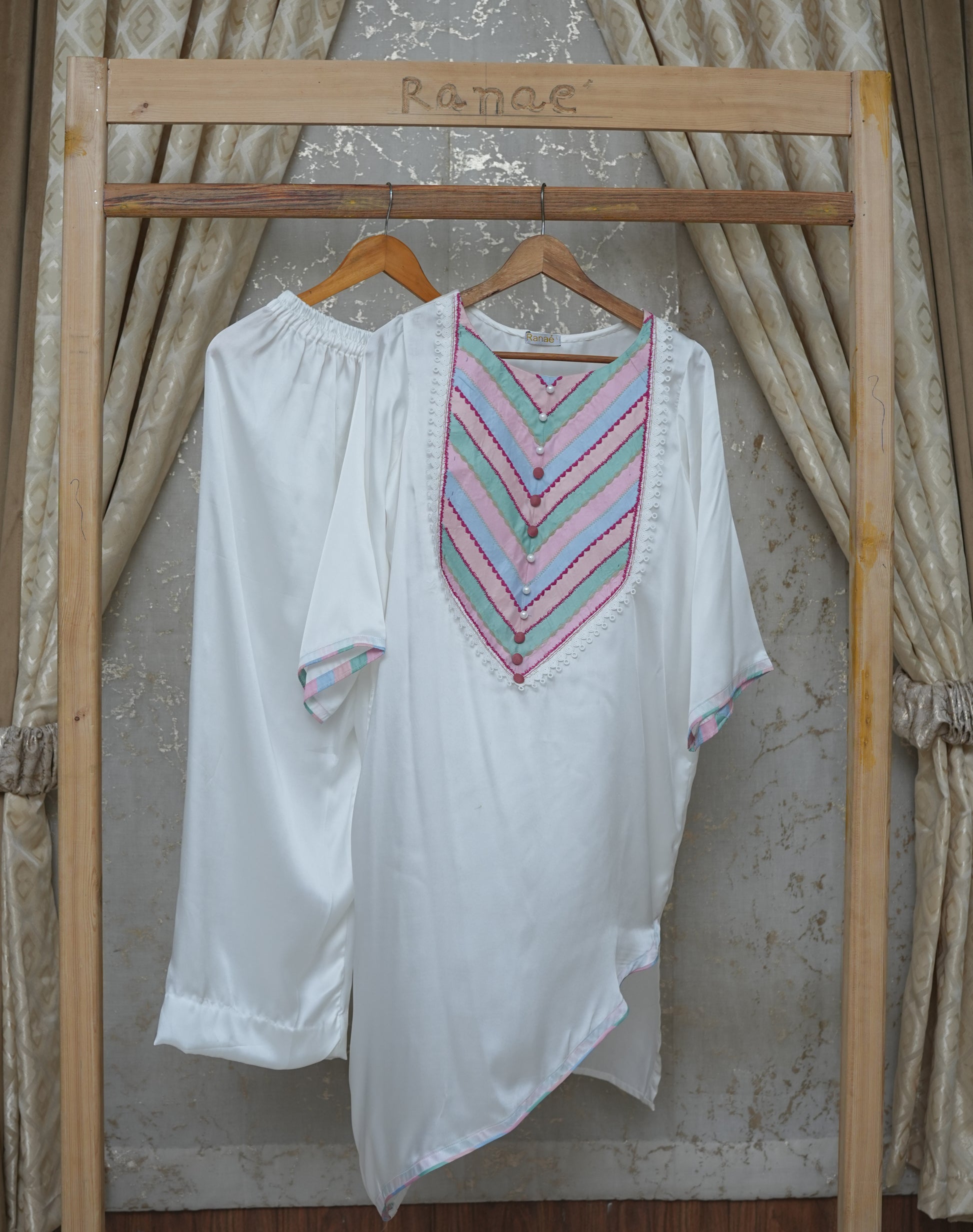 A white silk 2-piece pajama co-ord with asymmetrical top and multicolor embroidered neckline—luxury chic for festive or lounge wear.